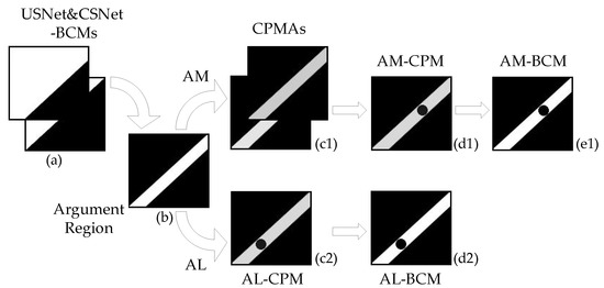 Process of re-estimating the argument region. (a): USNet&CSNet-BCMs; (b): Argument Region; (c1): CPMAs; (c2): AL-CPM; (d1): AM-CPM; (d2): AL-BCM; (e1): AM-BCM.