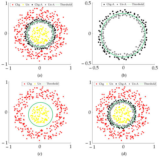 In the tests, we draw several findings of note as follows. First, it will lose significance if CD-USNet and CD-CSNet underperform in comprehensive coefficients (e.g., OA [31], Kappa, and F1 [32]); second, USNet and CSNet should have pretty remarkable sensitivity disparity to changed pixels/unchanged pixels, to produce the effective argument region; third, to generate the final detected BCM, we suggest to first transform the AM-CPM/AL-CPM into AM-BCM/AL-BCM by using K-means, as shown in Figure 5b, then merge the AM-BCM/AL-BCM with HAM shown as Figure 5c, to obtain the final detected BCM, as shown in Figure 5d; the discouraged subprocess start to obtain the combination CPM by merging the AM-CPM/AL-CPM with USNet-CPM (or CSNet-CPM), then K-means is used to generate the final detected BCM. In this circumstance, the threshold may occasionally fail to segment the AM-CPM/AL-CPM as part of the combination CPM, regarding the influence of non-argument pixels, as shown in Figure 5a.