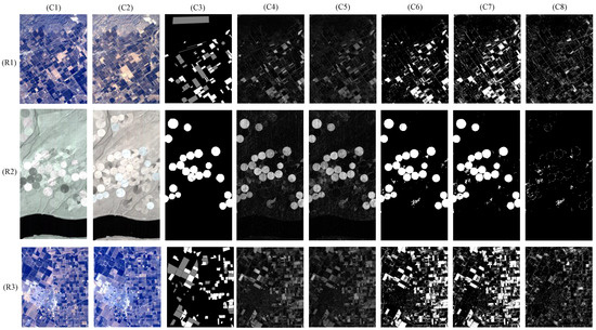 In Figure 6, (R1)–(R3) corresponds to the datasets ‘Santa Barbara’, ‘Hermiston’, and ‘Bay Area’, respectively. (C4)–(C7) show the change probability maps (CPM) resulting from unchanged and changed sensitivity networks, USNet-CPM and CSNet-CPM, and the binary change maps (BCM) related to USNet and CSNet, USNet-BCM, and CSNet-BCM, respectively. In (C4) and (C5), the bright regions indicate high change probability, while the dark regions indicate low change probability. To distinguish the changed pixels from the unchanged ones, the K-means clustering algorithm is then employed to generate the USNet-BCM and CSNet-BCM, as shown in (C6) and (C7), where the white marks and black marks represent the changed region and unchanged region, respectively. Accordingly, the argument region is therefore shown in (C8).