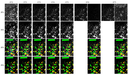 Figure 9, Figure 10 and Figure 11 show the visualization comparison of tested results on three datasets, with (C1)–(C7) corresponding to different methods. In Figure 9 and Figure 11, (R1)–(R4) display the CPM, BCM, F-HSM, and K-HSM, respectively; while in Figure 10, (R3) shows the HSM instead of F-HSM and K-HSM because the full image of dataset ‘Hermiston’ is known. In particular, (R1,C6)-left and (R1,C7)-left are two USNet-CPMs; (R1,C6)-right indicates the AM-CPM, while (R1,C7)-right represents the AL-CPM. By replacing the matched binary pixels of (R1,C6)-left/(R1,C7)-left with binary ones in (R1,C6)-right and (R1,C7)-right, the final detected BCMs are therefore generated for CD-SDN with AM approach (CD-SDN-AM) and AL approach (CD-SDN-AL), respectively, as shown in (R2,C6) and (R2,C7).