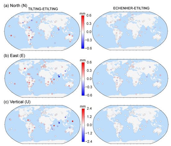 In addition to the statistical coordinate repeatability, the coordinate repeatability difference distribution between the TILTING and ECHENHER schemes and the ETILTING scheme is also shown in Figure 4, where the red color represents that the TILTING and ECHENHER schemes are worse than the ETILTING scheme. We can find that the coordinate repeatability differences between the TILTING and ETILTING schemes are obviously larger than those between the ECHENER and ETILTING schemes, demonstrating that the impact of the number of horizontal gradient parameters to be estimated is larger than the gradient mapping functions. In all 107 stations, there are 59, 69 and 60 stations with better N, E and U coordinate repeatability for the ETILTING scheme than for the TILTING scheme, again indicating the superior performance of the ETILTING method (left column of Figure 4). The U coordinate repeatability differences are most remarkable in the three coordinate components, and some middle and low latitude stations around the ocean show more significant differences with the maximal value of 2.32 mm (left column of Figure 4c) that is consistent with the modeling accuracy distribution.
