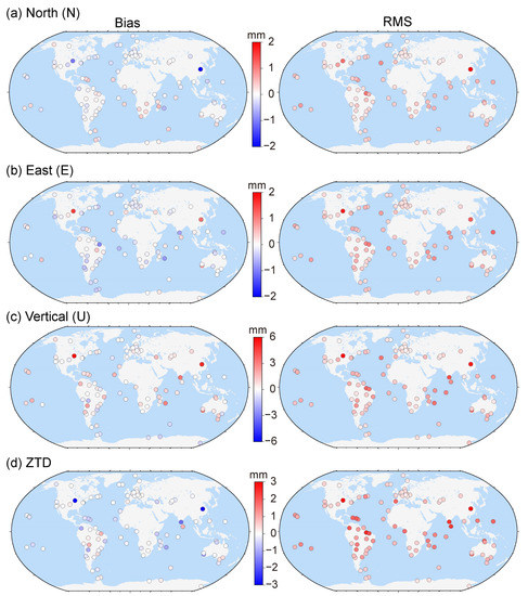 Bias (left) and RMS (right) distribution of north (a), east (b) and vertical (c) coordinates and ZTD (d) differences between the TILTING and ETILTING schemes.