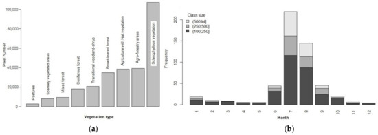 Number of pixels (30-m resolution) under analysis within the studied area (period 2004–2017) across CLC vegetation types (a) and fire frequency (b) across different months and fire size classes (in ha).