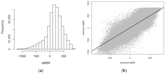 Histogram of rdNBR values ((a), calculated using the fire perimeters within the study area during the period 2004–2017; ONF and CFS datasets) and predicted versus observed rdNBR ((b), Pearson correlation coefficient 0.88).