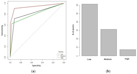 Area under the ROC curve for each severity class (a). Percentage of pixels classified into each severity class (b).