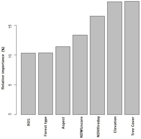 The most important variables were tree cover and elevation, followed by the spectral indices NDVIfireday and NDWIzscore (Figure 6).
