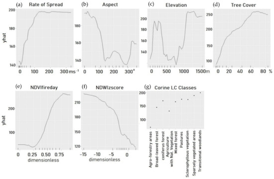 Partial dependence plots showing the marginal effect (yhat) of each explanatory variable (a–g) on rdNBR. Vertical black marks represent deciles values of each explanatory variable.