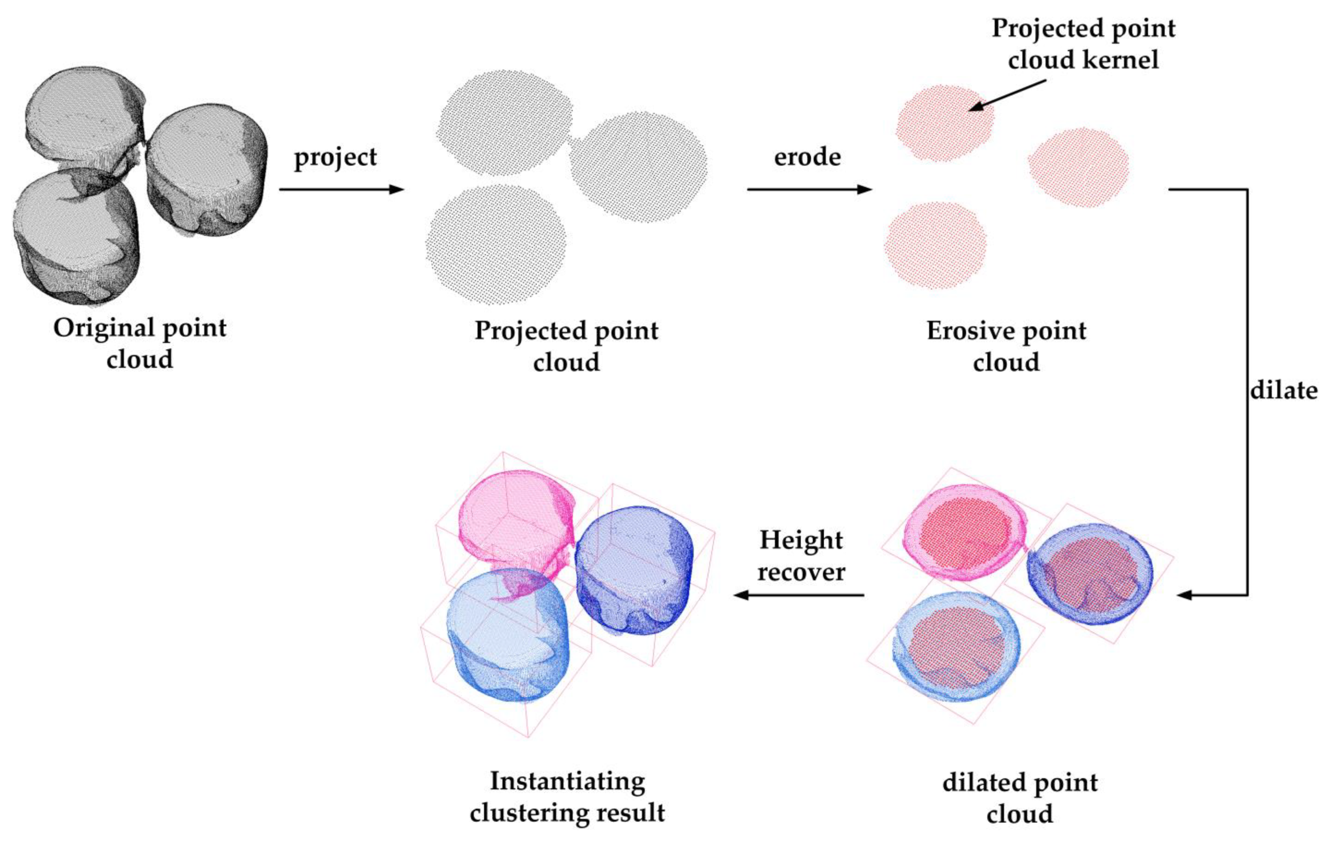 - Instantiating clustering. Based on the semantic segmentation result, an instantiating-clustering algorithm was applied to separate the point clusters into individual clusters.