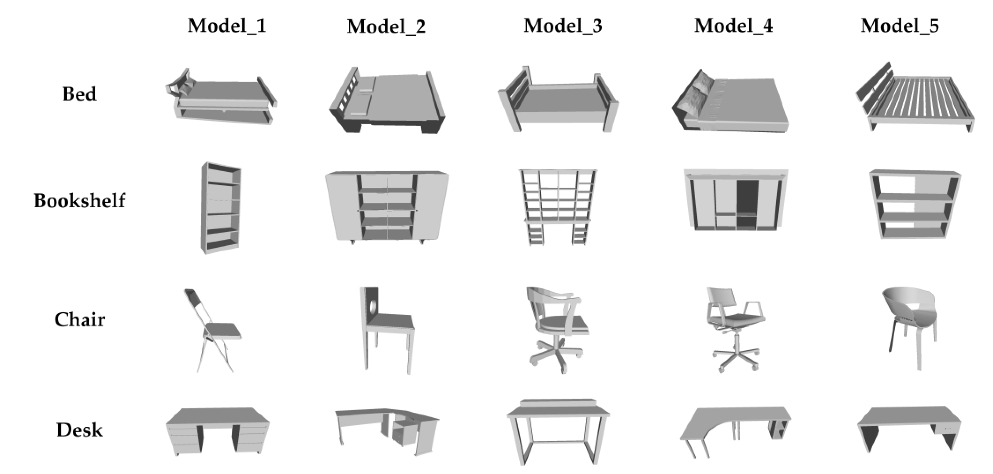 - Unstructured-objects reconstruction. We retrieved the similar candidate models in our 3D-ESF indoor model library with the semantic label and ESF descriptors. Next, we registered the model to the scene;
