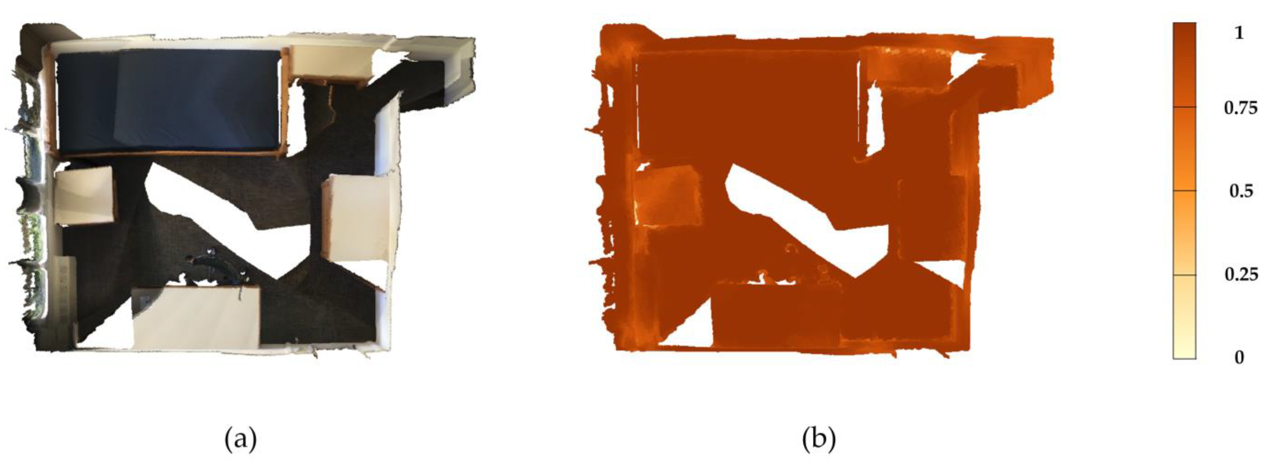 - Whelan, T.; Kaess, M.; Fallon, M.; Johannsson, H.; Leonard, J.; McDonald, J. Kintinuous: Spatially Extended KinectFusion. CSAIL Tech. Rep. 2012. Available online: https://dspace.mit.edu/handle/1721.1/71756 (accessed on 6 October 2021).