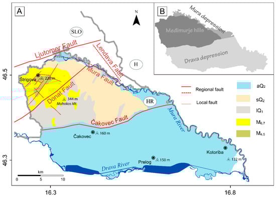 (A) Geological map of Međimurje. (B) Tectonic units of Međimurje. Stratigraphic and tectonic units are simplified after the Geological map of the Republic of Croatia 1:300,000 [29], the Basic Geological Map of Croatia and Slovenia 1:100,000 sheet Čakovec [30], and sheet Nagykanizsa [31]. M4,5—Middle Miocene, M6,7—Late Miocene, lQ1—Pleistocene, sQ2 and aQ2—Holocene. Faults are derived from the abovementioned maps [27,32].