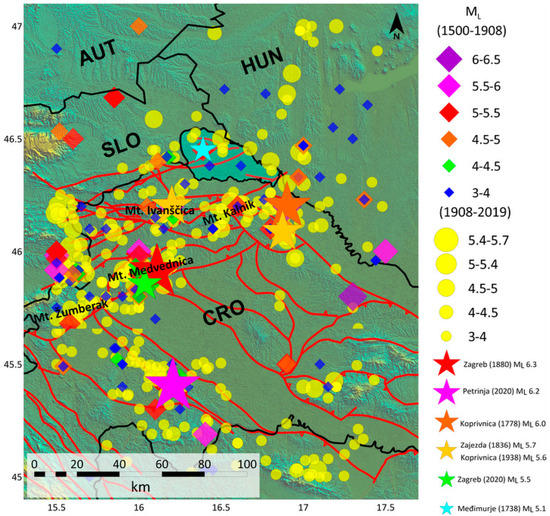 Spatial distribution of earthquake locations in the investigated area (373 BCE–2019 CE; according to the Croatian Earthquake Catalog—CEC; updated version first described in Herak et al. 1996, [5]). The most notable historical and recent earthquakes important for this study analysis are shown with colored star markers. The most important seismogenic faults are shown with red lines (after Ivančić et al. [36]). Međimurje County is shown in the shadowed area.