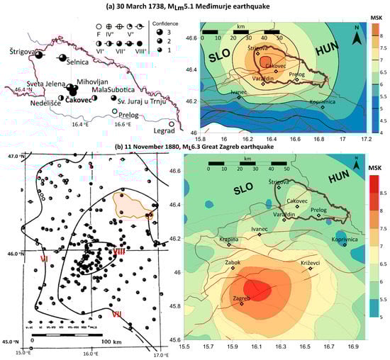 The most important earthquake for the Međimurje region occurred on 30 March 1738 with the epicenter about 8 km north-northwest of the town of Čakovec (Herak et al. [3]). The estimated macroseismic magnitude of the Međimurje earthquake of MLm5.1 was probably triggered by the movement on the hanging wall of the reverse Čakovec fault. This earthquake was studied in detail by Herak et al. [3] taking into account older seismological literature and primarily church archives to estimate earthquake effects in this region. The epicentral intensity was estimated to be I0 = 7.9° MSK (Medvedev–Sponheuer–Karnik). Figure 3a shows the observed macroseismic map for the earthquake of 30 March 1738 adapted from Herak et al. [3] referring to average soil site conditions. Damages to individual sites were reported (details in Herak et al. [3] and references therein): the Church of St. Jerome Štrigova built in the 15th century was demolished from the earthquake and was later reconstructed in 1749; the Monastery in Šenkovec (Sv. Jelena-St. Helen) was abandoned after the earthquake and completely destroyed in the 1880 Zagreb earthquake; churches in Selnica, Mihovljan, Nedelišće, Mala Subotica, Sveti Juraj u Trnju, and Prelog were also severely damaged as well as The Old Town Zrinski in Čakovec, built in the 13th century, and the Parish church and Franciscan monastery of St. Nicholas in Čakovec. In 18th-century Međimurje, traditional buildings were constructed from timber, except for prominent noble and church buildings, which were built of brick and stone.