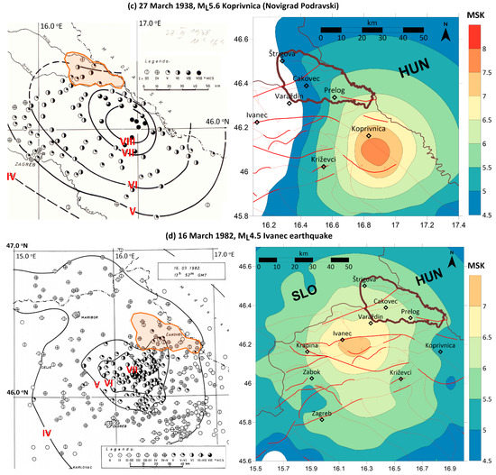 Mt. Kalnik–Koprivnica and Varaždin–Mt. Ivanščica–Kozjansko epicentral areas are very close to the Međimurje region (approx. 20–30 km distant). Most notable historical ML5.5+ earthquakes are the 8 November 1778 Koprivnica-Legrad ML6.0 and the 12 November 1836 Zajezda ML5.7, which were largely felt in the whole northwestern part of Croatia [2,4,37]. The Great Zagreb Earthquake ML6.3 that struck Zagreb on 9 November 1880 [4,38] was felt over a very wide area, as well in the Međimurje region (approx. 80 km from the epicenter) with the macroseismic intensity assessed from historical data of VI–VII °MCS (Figure 3b). The abandoned monastery in Šenkovec (Sveta Jelena-St. Helen) and the parish court in Sveti Juraj u Trnju were completely destroyed. The 31 July 1838 Mwm4.8 earthquake (macroseismic moment magnitude), with the epicenter around the western Croatian border with Slovenia, was also largely felt, particularly in the part of Međimurje Hills [39]. The 27 March 1938 ML5.6 earthquake with the epicenter near Koprivnica (Novigrad Podravski) destroyed many houses and churches in the epicentral area [2,4] with reported strong shaking in central and lowland Međimurje (observed macroseismic intensity of V–VI °MCS, Figure 3c), especially around Legrad and Kotoriba (approx. 20–30 km from the epicenter). In the last 40 years, there were a few moderate 4–5-magnitude earthquakes (CEC, [5]) with the epicenters nearby Međimurje that were largely felt across the region: the 16 March 1982 ML4.5 earthquake with the epicenter below Mt. Ivanščica (macroseismic observations were assessed: VI-VII °MCS in epicentral area and at some localities in Međimurje: V °MCS, Figure 3d) and the 1 June 1993 M4.7 earthquake with the epicenter in the Mt. Kalnik area. In addition, there had been several earthquakes with magnitudes varying from 4 to 5 close to the national border with Slovenia (western border) and Hungary (northeastern border) (Figure 2).