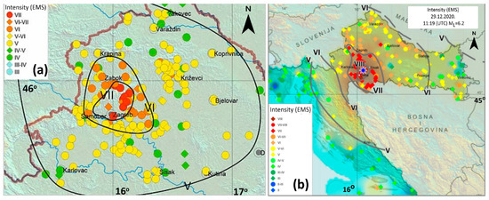 Macroseismic intensity map of the: (a) 22 March 2020 Zagreb M5.5 Zagreb earthquake. (https://wwwpmf.unizg.hr/geof/seizmoloska_sluzba/o_zagrebackom_potresu_2020/druga_godisnjica_zagrebackog_potresa (accessed on 10 July 2022)) (b) 29 December 2020 Petrinja M6.2 earthquake (https://wwwpmf.unizg.hr/geof/seizmoloska_sluzba/potresi_kod_petrinje/2020-2021 (accessed on 15 July 2022)).