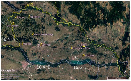 The Međimurje region is the smallest county in Croatia (729 km2). However, after the Croatian capital City of Zagreb, this is the second highest populated area in Croatia, with 156 people/km2 (https://medjimurska-zupanija.hr/opci-podaci-mz/ (accessed on 10 July 2022)). It is situated between the Drava and Mura rivers and is divided into two subgeomorphological parts: Lowland Međimurje to the northeast, east, and south; Međimurje Hills to the northwest. Lowland Međimurje is an alluvial basin distinguished by three major subbasins: Mura, Čakovec, and Kotoriba. A slightly elevated hilly area is referred to as Međimurje Hills with elevations ranging between 132 and 344 m.a.s.l. The latter is the elevation of the highest hill—Mohokos, morphologically the most pronounced structure in Međimurje.