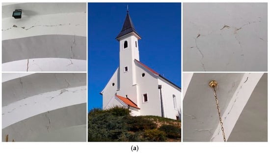 The Zagreb earthquake damaged the interior of the chapel of St. Margaret built of brick in 1775 in Kapelščak in Međimurje Hills (Figure 6a, local newspaper report). The Petrinja earthquake damaged the museum in Čakovec that is part of the Old Town Zrinski. Ridge roof tiles of the SE and SW wings of the central palace were partially covered with ridge tiles, which caused occasional holes in the top of the roof. The decorative roof mace on the SE roof (metal, height about 130 cm) is tilted to the side (personal communication Čakovec Museum of Međimurje). In addition, visible cracks were observed in the interior of the museum (Figure 6b, author’s observation). The town hall in Goričan (built in 1945) and churches in Goričan (built in in 1770, Figure 6c,d) and Draškovec (built in 1822, famous for its two bell rowers, Figure 6e) were slightly damaged from the Petrinja earthquake with visible cracks on the outer walls (author observation). Most interestingly, the parish church in Sveti Juraj u Trnju again suffered damage from both Zagreb and Petrinja earthquakes (Figure 6f). The catastrophic earthquake that hit Međimurje on 30 April 1738 severely damaged the parish church in Sveti Juraj in Trnju. After that, a new church started to be built and was completed in 1747, but soon proved to be too small for a large number of believers. The wooden ceiling was removed and the church received a brick vault. The roof is, therefore, raised by 4 m. The construction of the belfry was completed in 1775. The strong earthquake that hit Međimurje on 9 November 1880 collapsed the old rectory and the church was also badly damaged. Renovation was completed in 1886.
