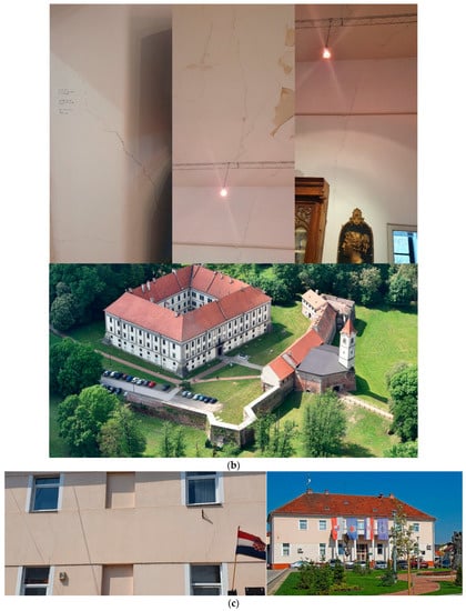 On 22 March 2020, Croatian capital Zagreb was hit by the strongest earthquake since 1880 [6] with a magnitude of 5.5. The intensity of VII–VIII °EMS-98 was observed close to the earthquake epicentral area, while the intensity felt in Međimurje was IV–V °EMS (Figure 4a). On 29 December 2020, the wider area of Petrinja was hit by a destructive earthquake with a magnitude of 6.2 with an observed intensity of VIII-IX °EMS in the epicentral area [7,8]. The earthquake was felt across the entire territory of Croatia, in particular, in the northwestern part of Croatia. The observed intensity in the Međimurje region was V–VI °EMS (Figure 4b). Further from the epicenter (distances > 30 km), the observed higher intensity (Figure 3b) and recorded damages to older buildings were potentially affected by the local site effects, the area along the Sava River, Hrvatsko Zagorje, and the area along the Drava River, including the Međimurje region [7]. Both Zagreb and Petrinja 2020 earthquakes had consequences in the northwestern part of Croatia. Numerous churches, and cultural and historical buildings were damaged in this part of Croatia with the main damage on roofs, chimneys, and unreinforced walls. For example, Trakošćan Castle was damaged by both earthquakes [44].