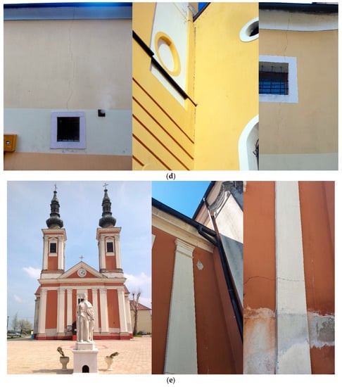 In the Sveti Urban area, a family house (Figure 6g) showed deformations and cracks that were caused by an activated landslide after the Petrinja earthquake (personal communication, owner of the house). Significant earthquake damage from the Petrinja earthquake occurred in the Parish church of St. Mary Magdalene (built in the 18th century) in Štrigova where there were multiple cracks visible on the walls and vaults of the nave. Parish churches in Macinec (built in late-19th century) and Sv. Juraj na Bregu are (built in the middle of the 19th century) marked by characteristic contact movements of the bell tower, whose direct connections with arches and vaults resulted in cracks. Cracks were caused by the bell movements and local site effects. Bells have been reduced in all significantly damaged churches (personal communication Ordinariate of the Diocese of Varaždin). Numerous houses, mostly older ones (built before 1964), reported small material damage, in the form of damage to the roof and chimney (personal communication Civil Protection Headquarter of Međimurje County). Based on the EMS intensity scale, the observed damage effects, visible damage, and cracks to older masonry structures shown in Figure 6 point to an intensity of V–VI, corresponding with observations in Figure 4.