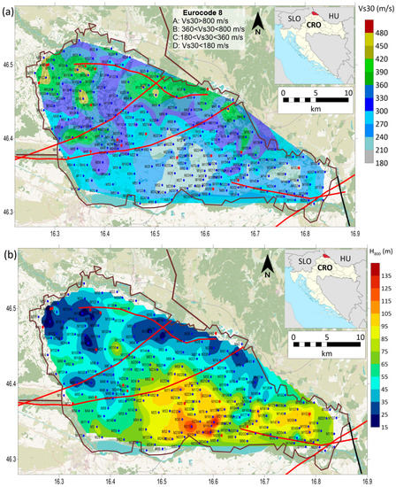 Maps of (a) estimated Vs30 and (b) H800 of the Međimurje region. The most important seismogenic faults are shown with red lines (after [36]). The locations of HVSR examples shown in Figure 8 are marked with red markers and labels.