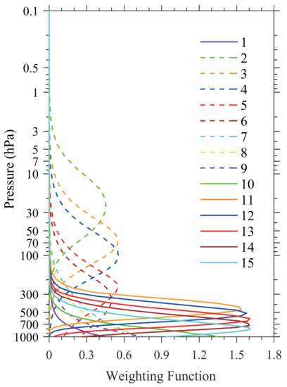 Assuming that the background field is an unbiased reference, the calculation of the “O−B” is widely used to estimate the biases and errors of the postlaunch instruments [6]. The vertical profiles of the 15 channels of FY-3E MWHS-2 are shown in Figure 1. The 118-GHz channels (shown as dotted lines) have a wide vertical detection range, which extends from near the surface to approximately 20 hPa, allowing for a complete temperature profile of the atmosphere. The sounding levels of the water vapor absorption channels are evenly distributed vertically, with weighting functions peaking in the range of 900 hPa to 400 hPa. Therefore, this instrument can provide a detailed distribution of humidity in the middle and lower troposphere. As the channel numbering order increased, the sounding level heights of the 118-GHz channels and water vapor absorption channels all decreased.