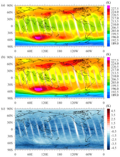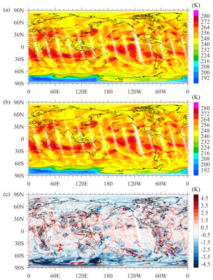 The observed brightness temperature mainly represents the temperature characteristics of the stratosphere, where the temperature in the tropics is lower than that in the middle and high latitudes due to the ozone distribution. The sun shines more directly on the Northern Hemisphere in summer, and the whole North Pole is in the high temperature region. In the Southern Hemisphere, the middle latitudes are characterized by high temperatures, while the Antarctic is characterized by low temperatures. Due to cross-track scanning, the brightness temperature cannot properly reveal the delicate temperature structure in the tropical region, only showing a decrease in the temperature on both sides of the scanlines. Simulations of the brightness temperature reproduce the spatial characteristics of the observation, including the high temperature zones located at the middle and high latitudes in the Northern Hemisphere and the middle latitudes in the Southern Hemisphere as well as the low temperature zone at the South Pole. The RTM also exhibits the limb darkening effect of the Earth sense in the tropical region. However, the brightness temperature simulated by the model is approximately 3.5 K higher than that observed, making the “O−B” distribution uniformly negative. Figure 2c shows that there are obvious striping noises along the tracks in the “O−B” distribution, which will be further discussed in Section 4.