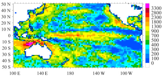 The “O−B” is assumed to be unbiased in satellite data assimilation and is widely employed to analyze the error characteristics of the instrument. To exclude the influence of clouds and surface emissivity, only clear-sky pixels on the Pacific Ocean were taken as the samples. Figure 4 shows the spatial distributions of clear-sky marine data counts within 2 × 2 grid boxes in the 15-day sampling period on the Pacific Ocean. Most of the regions have more than 400 clear-sky FOVs, except for the regions with less than 100 clear-sky FOVs on the equatorial sides of the eastern Pacific. The area with the highest clear-sky data counts is off Northeast Australia, where the maximum is over 3300, while the areas with less clear-sky FOVs are roughly distributed in the Intertropical Convergence Zone (ITCZ), south of the equator in the eastern Pacific Ocean, northeast of Hawaii, and near the Solomon Islands.