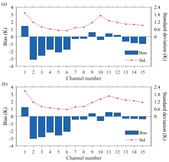 Using the clear-sky marine data mentioned above, the 15-day mean values and standard deviations of the “O−B” were calculated in this study (see Figure 5). The blue bars and the red dotted line in Figure 5 represent the mean values and the standard deviations of each channel. As displayed by Figure 5a, the bias of each channel is basically between −4 K and 2 K. Moreover, most channels show negative biases except for those in Channel 1, Channel 9 and Channels 11 to 12. The biases of the 118-GHz channels increase with decreasing sounding level heights. For the upper-air sounding Channel 2, the peak weighting function is located at approximately 70 hPa with a bias of −3 K, while Channel 9, whose detection level is close to the ground, is biased by 0.6 K. In contrast, the biases of the water vapor absorption channels decrease from 0.4 K (Channel 11) to −1 K (Channel 15) with decreasing detection heights. The standard deviations of the 15 channels are all less than 2 K, among which those of the two window channels are larger than the others. Channel 1 has the largest standard deviation of approximately 1.9 K, followed by Channel 10 which has 1.75 K. The standard deviations of the 118-GHz channels decrease first, from 1.2 K (Channel 2) to 0.5 K (Channel 6) and then increase with decreasing detection heights to 1.2 K for Channel 9. In contrast, the water vapor absorption channels have continuously deceasing standard deviations from 1.3 K (Channel 11) to 0.9 K (Channel 15). On average, the standard deviations of the water vapor absorption channels are slightly higher than those of the 118-GHz channels.