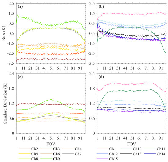 Variations of the biases ((a,b), unit: K) and standard deviations ((c,d), unit: K) with the 98 FOVs for the 15 channels. The left column indicates the results of the 118-GHz channels, and the right column indicates the other channels.