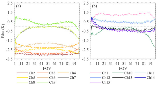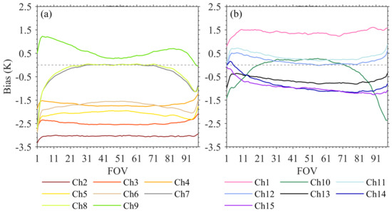 For the two window channels, the biases of Channel 1 are positive and vary little with the FOVs, ranging from 1.2 K to 1.6 K. However, the biases of Channel 10 significantly change with the scanning angles, which increased from approximately −1.3 K for the first FOV to approximately 0.4 K for the central FOV and then decreased to approximately −2.4 K for the last FOV. In the 118-Ghz channel, the deviation of Channel 2 hardly changes with the field of view. The absolute values of the biases of Channels 3 and 4 at both ends of the scanlines are approximately 0.4 K smaller than those in the middle. For Channels 5 to 9, the absolute bias values generally increase with increasing scanning angles (except for the FOVs near the endpoint). The maximum bias difference between Channels 5 and 6 is approximately 0.4 K, and that between Channels 7 and 9 is approximately 1.3 K, which may result from the vertical gradient of temperature. For all the water vapor absorption channels, the average bias of the first 49 FOVs is slightly larger than that of the last 49 FOVs, which may be due to the polarization misalignment in the radiometer receiver [33]. Figure 6a,b show a jagged change in the bias along the scanning direction, which is recognized as the high-frequency oscillating noise related to the scanning positions and will be further discussed in Section 4. The same calculation is performed using the NCEP FNL data as the background field. It can be seen from Figure 7 that the high-frequency oscillating noises still exist in the biases of each channel, indicating that the noise exists in the instrument observation and is independent of the background field.
