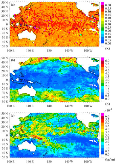 As can be seen from Figure 9, the standard deviation of “O−B” for Channel 13 is within 2.0 K, and the large values are mainly located in the Sea of Japan, the ocean south of Australia, and the northeast Pacific. The standard deviation of “O−B” increases significantly with the increasing latitude. Although the large atmospheric temperature variability at 600 hPa also appears in the high latitudes, the comparison between Figure 1b and Figure 9a shows that the standard deviation of “O−B” has little relationship with atmospheric temperature variability since there is no large temperature variability center in the Sea of Japan and the ocean south of Australia and the location of the large value center of temperature variability in the northeast Pacific is significantly different from that of the “O−B” standard deviation. Figure 9c shows the spatial distribution of the variability of specific humidity at 600 hPa. The large specific humidity variability is mainly located in the tropics where moisture is abundant and small- and meso-scale weather systems prevail. This is obviously different from the spatial distribution characteristics of “O−B” standard deviation.