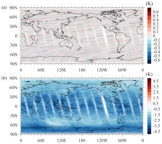 Figure 11a,b show the striping noise isolated from the observations in Figure 2a and the new “O−B” distribution after the striping noise mitigation. The striping noise for Channel 3 is at approximately 0.2 K with a relatively uniform global distribution, indicating that noise extraction is not affected by the original brightness temperature distribution. Compared with Figure 2c, the striping noise in the “O−B” distribution in Figure 11b is significantly weakened, while the other features are successfully retained.