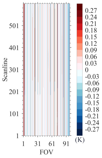 According to Figure 6a,b, obvious jitters with scanning angles are found in MWHS-II, which is also found in the microwave humidity sounders carried by the early Fengyun series satellites. Thus, Zou et al. [35,39] and Zhu et al. (2021) developed a noise filtering method to compare the characteristics of the along-scan noises in different Fengyun series microwave humidity sounders and found that the along-scan noise is significantly weakened with the instrument upgrade. The method proposed by Zou et al. [39] was also used to extract the along-scan noise to further clarify its influence. Zou et al. [39] found that the along-scan noise has a similar characteristic to the striping noise; in addition, the striping noise is relatively fixed along the scanline, while the along-scan noise is relatively fixed along the track. Therefore, by decomposing the brightness temperature and simply applying the five-point smoothing to the first mode from Principal Component Analysis, the along-scan noises can be well removed from the observations. Figure 12 shows the noise distribution after subtracting the reconstructed brightness temperature from the observation for the 600 scanlines in Channel 3. The noise value is approximately 0.3 K, and the noise of the second and 97th FOV is significantly larger, which may result from the large errors of the two-edge FOVs (i.e., the first and 98th FOV).