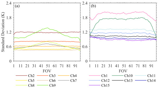 According to Figure 6c,d, the standard deviations for the window channels (i.e., Channel 1 and Channel 10) and the 118-GHz channels are basically symmetrical with respect to the magnitude of scanning angles. The standard deviations in the 12 FOVs at both ends of the scanlines for the two window channels significantly decrease with increasing scanning angles. The decreasing gradient of Channel 1 is approximately 0.03 K/FOV and that of Channel 10 is approximately 0.06 K/FOV, while the standard deviations in the central 74 FOVs show no dependence on the scanning angles. Among the 118-GHz channels, the standard deviations of Channels 7 to 9 gradually decrease from the center to the two ends of the scanline, with decreases of approximately 0.2 K (Channel 7), 0.3 K (Channel 8), and 0.5 K (Channel 9), respectively. The other 118-GHz and water vapor absorption channels do not appear to have a scanning angle dependence in their standard deviations.