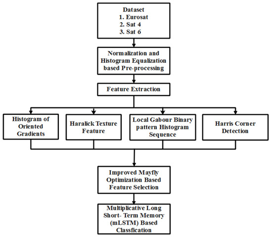 In this research, the elements or features that are found on the Earth’s surface are referred to as land usage and land cover. The Sat 4, Sat 6, and Eurosat are used in this work for experimental research. After gathering the satellite images, pre-processing is conducted using normalization and histogram equalization, which are used to enhance image quality. After normalizing the collected satellite images, feature extraction is carried out to extract the feature vectors from the images utilizing the HOG, LGBPHS, HCD, and Haralick texture features. Using the Improved Mayfly Optimization (IMO) algorithm, feature selection is carried out after the feature vectors are extracted. After extracting the optimal features, the Multiplicative Long Short-Term Memory (mLSTM) network is exploited for classifying the LULC classes. The general process of the satellite image classification is depicted in Figure 1.