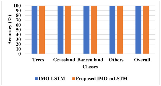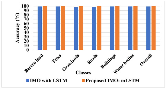 Table 9 shows the results of the comparison study between the proposed and previous methods. The proposed model includes two bands of information and smaller filters that are evaluated to categorize images into dissimilar categories. The created method was associated with prior networks in light of precision, recall, and accuracy in various literature. In this paper, an enhanced mayfly optimization technique is integrated with the mLSTM classifier to improve the performance of LULC. The suggested feature selection approach enables the mLSTM classifier, which achieves higher performance of the classifier by reducing the “curse of dimensionality”. Figure 18 shows the comparative analysis of accuracy. In Table 9, the proposed IMO-mLSTM is compared with existing classes named GoogleNet [22], 2-band AlexNet [23], 2-band ConvNet [23], ResNet-50 [24], AlexNet [29], and ConvNet [29] in terms of accuracy.