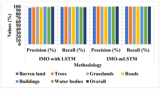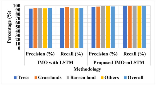 This dataset is exploited to assess the projected method’s effectiveness in categorizing four LC classes. With 70% training and 30% testing of the data, the overall performance is confirmed for 500,000 satellite data. The proposed method with different classifiers: IMO with LSTM was evaluated in Table 2 and Table 3. Table 2 and Table 3 clearly show that the proposed IMO-mLSTM classifier increases LULC classification accuracy by up to 1% when related to conventional classifiers. Figure 5 displays the behavior of precision and recall on the Sat 4 dataset. Figure 6 illustrates the behavior of accuracy on the Sat 4 dataset.
