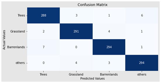 The Sat 6 dataset is used to evaluate the developed efficacy while classifying six different types of LCs: grassland, water bodies, buildings, barren ground, roads, and trees. The effectiveness of 40,500 satellite images is evaluated, with 70% of the data being trained and 30% being tested. The proposed method (mLSTM-IMO) obtained better results when compared with other classification methods such as LSTM and IMO methods in terms of recall, and precision which are shown in Table 6. In comparison with other classification strategies, the proposed mLSTM classifier performed better accuracy in LULC classification which is shown in Table 7. The proposed mLSTM classifier achieved 99.94% precision, 99.97% recall, and 99.97% accuracy in this database. Figure 11 shows the performance analysis of precision and recall on the Sat 6 dataset. Figure 12 shows the classification accuracy on the Sat 6 dataset, while Figure 13 shows the visual results of the Sat 6 dataset. Figure 14 shows the confusion matrix for the Sat 6 dataset.