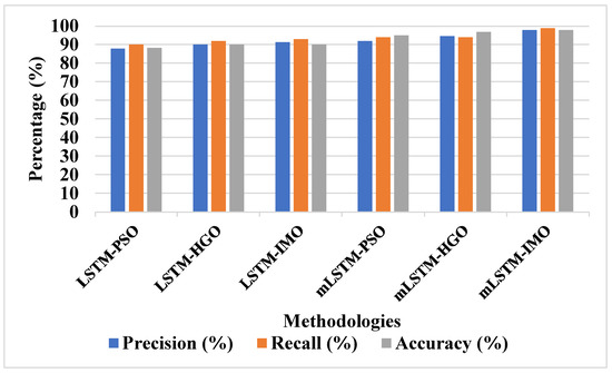 From Table 10, it can be clearly inferred that the proposed IMO with mLSTM achieves a better classification accuracy of 91%, which is superior to existing DBN [28] and IMO with LSTM which attain only 81% and 87%, respectively. Figure 19 shows the comparative analysis graph for accuracy performance.