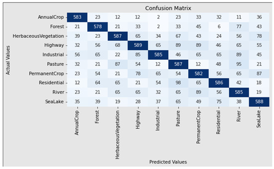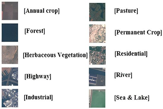The satellite data were acquired in European cities and scattered across thirty-four nations. Data are obtained with 27,000 annotated and geo-linked texture features, each of which is images in size. The Eurosat database is divided into ten classes, each of which comprises 2000–3000 images. Commercial establishments, motorways, and residential complexes are LULC-type data. Figure 3 displays a sample image of the Eurosat database [22,30].