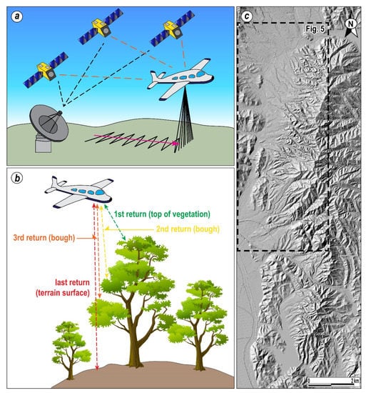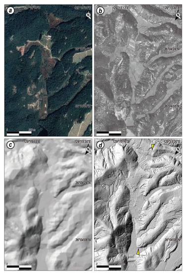 The LiDAR remote sensing method records data using a laser pulse that reflects off the ground. The arrival time of the returned laser pulse is calculated and location information (X, Y, Z) of the reflection point is captured. Airborne LiDAR mapping acquires 3D point clouds, which are a large amount of spatial location (X, Y, Z) data for the reflection points of laser pulses and classifies the data according to reflection characteristics. The method is cost-effective, efficient, and accurate, producing DEMs and digital surface models (DSMs) including topography and features such as trees and artificial structures. Unlike satellite images, aerial images, and digital topographic maps, LiDAR is capable of removing trees and showing the actual ground surface level, thereby providing precise surface information, which is essential for detailed topographic mapping (Figure 3) [85,86,87,88]. In airborne LiDAR mapping, terrain relief is measured at regular intervals along the flight path of a specialized aircraft with a mounted laser pulse transceiver, global navigation satellite system (GNSS) receiver, and inertial navigation system (Figure 4a). The precise position of the laser scanner from the ground reference station and the vertical distance of the laser pulse reflected from the ground is determined using the differential global navigation satellite system (DGNSS) technique. A laser scanner is equipped with a multi-pass function in which a plurality of reflected pulses is acquired with respect to one pulse. The pulse mode varies depending on the model, but four pulse systems (discrete form) namely, first pulse, second pulse, third pulse, and last pulse are predominantly used (Figure 4b). In this study, we used full-waveform equipment, which stores all reflected waves, rather than the discrete form that detects four pulses. The most notable difference between the two forms is the ability to receive reflected waves, as such the full waveform is relatively advantageous for acquiring ground data when surveying a forested area. The LiDAR mapping was performed using a Cessna 208 aircraft, and a Lite mapper-6800 (IGI co., Germany) laser pulse transceiver. The survey area was 69.6 km2, 875.4 km long, with a 60% overlap, and with 124 air courses, which is approximately four times more than the flight courses typically performed in Korea. A total of 1,856,096,462 laser return points were acquired and following post-processing, a total of 317,989,564 ground points remained. The average total point density was 21.28 points/m2 (maximum: 26.53 points/m2 and minimum: 17.23 points/m2), and the average ground point density was 3.64 points/m2 (maximum: 4.35 points/m2 and minimum: 3.07 points/m2). After verifying the accuracy through on-site measurements, the vertical error was measured at an average of 8.2 cm, a maximum of 15.7 cm, and a minimum of 1.2 cm. We conducted detailed topographic mapping using hillshade images based on DEMs obtained from the high-resolution LiDAR data (Figure 4c).