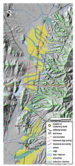 The Byeokgye outcrop [67,68,78] and the Dangu trench [79] sites in the central part of the Yangsan Fault, the study area, have been reported as the Quaternary faults (Figure 2c). A fault surface with an attitude of N12°E, 80°SE that cuts between the Cretaceous felsic rocks and Quaternary sediments is evident at the Byeokgye site. Based on the shear band observed in the two-fault gouge layer, drag fold of the sedimentary layer in the footwall, and near-horizontal slickenline observed in the fault surface, it was interpreted that strike-slip faulting occurred after reverse faulting [78]. Furthermore, the optically stimulated luminescence (OSL) age of the Quaternary sediments is 75,000 ± 3000 years [67], indicating that the most recent surface faulting event at this site took place after this date. A trench survey excavation was conducted at the Dangu site, ~ 50 m north of the Byeokgye site, to obtain more detailed paleoseismological information [79]. Paleoseismic surface ruptures (fault surface: N10–20°E, 75–79°SE) possessing similar geometric and kinematic characteristics to those of the Byeokgye site were observed in two sections of the trench. Based on the drag fold of the Quaternary sediment, slickenline, and three fault gouges observed in the trench, it was interpreted that the surface faulting of the strike-slip with the reverse component occurred a minimum of three times after the Quaternary sediments were deposited. In addition, the timing of the most recent surface faulting event at the Dangu site, calculated using a combination of the OSL age, radiocarbon age, and archaeological interpretation of the Quaternary sediments, was found to be after 7500 ± 300 years [79].