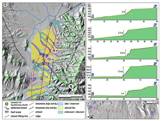The main lineament of the northern section is identified as a linear arrangement of deflected streams and fault scarps (Figure 7a). Unlike in the south, the fault scarps in the north show surface uplift estimated at a vertical offset of between 2–4.2 m of the same alluvial fan surface cross-section (Figure 7b). The 3D view of the hillshade image displays weak fault scarps in the southern section; however, they are visible to the naked eye (Figure 7c). On the western side of the main lineament, high activity lineaments with a vertical offset of 3–7.5 m developing into an en-echelon array are present (Figure 7a,b), and an NNE-striking high activity lineament with deflected streams with a dextral offset is present on the eastern side (Figure 7a). The horizontal offsets calculated based on the three deflected streams are 92 m, 98 m, and 150 m. The tendency for the offset to decrease as the distance from the main lineament increases indicates that the fault offset branching from the main fault gradually decreases.