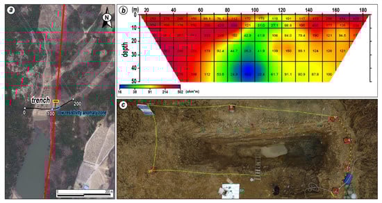 An electrical resistivity survey is a geophysical technique used to recognize underground structures such as faults and rock boundaries. Electrical resistivity tomography (ERT) measures the potential differences in underground structures using a pair of electrodes to measure the difference in electrical resistivity which is then observed by interpreting the resultant 2D cross-section image. The electrical resistivity of rocks is determined based on the type of rock, porosity, permeability, and geological structures such as faults and joints [89]. When compared with ground penetrative radar (GPR), the ERT method has a deeper depth range and is able to distinguish the groundwater table. However, its limitation is that it is greatly affected by surface and underground conductive material. It is most commonly used in fault detection worldwide and is favored in Korea because the biophysical conditions presented by undulating forests and cultivated fields such as rice fields are not favorable for other geophysical techniques [38]. In this study, the AGI Mini Sting was used to perform the ERT along a lateral line of 150–200 m, with an electrode spacing of 10 m, and a depth of 50 m. Measurement data were processed into 2D images by inverse resistivity modeling using finite difference method (FDM) or finite element method (FEM) techniques, and geological structure and ground characteristics were expressed as high or low resistivity anomalies. The trench site was selected by precisely locating the fault using the analyzed ERT profile.