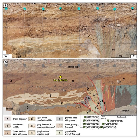 (a) Trench site photomosaic. (b) Trench sketch. Seven fault surfaces (red line) and nine deposit units are evident in the section. Division of unit B by the most recent faulting event (3200 ± 200 year).