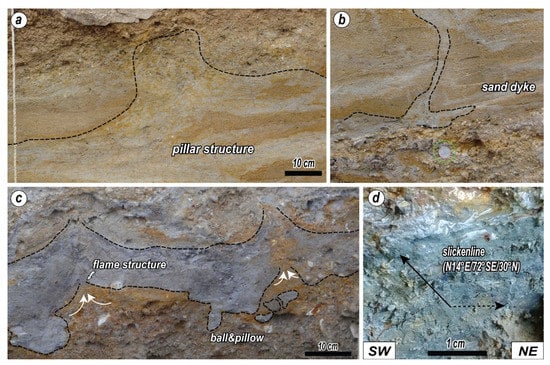 Photograph showing features in a section of the trench. (a) Pillar structure and (b) sand dyke in unit E. (c) Flame and ball and pillow structures in unit G. (d) Slickenline on the F6 fault surface indicating dextral reverse faulting.