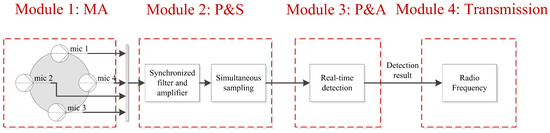 Our implemented system can be divided into the four modules according to their functions: microphone array (MA), preprocessing and sampling (P and S) module, real-time data processing and acquisition (P and A) module and transmission module [30]. Four microphone arrays are used to collect the acoustic signal in the deployed area. The collected acoustic signals are then sampled in the P and S module to obtain four simultaneous digital signals by the synchronized filters and amplifiers [31]. The detection algorithm is implemented on the digital signal processors (DSP) chip of the real-time P and A module. The detection results are finally transmitted to a terminal device through radio frequency. The diagram of the system hardware process is shown in Figure 1.
