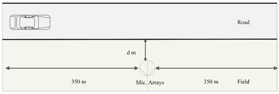 The acoustic signals are collected with microphone arrays in the intelligent sensor system deployed in the field. The vehicle recorded includes a small wheeled vehicle, a large wheeled vehicle and a tracked vehicle. The sensors are deployed 30 m, 50 m, 80 m and 150 m away from the road for the small wheeled vehicle. For the tracked vehicle and the large wheeled vehicle, the sensors are deployed 200 m, 250 m and 300 m away from the road. The length of road is 700 m, 350 m on each side of the microphone arrays. The recording scene is illustrated in Figure 3.