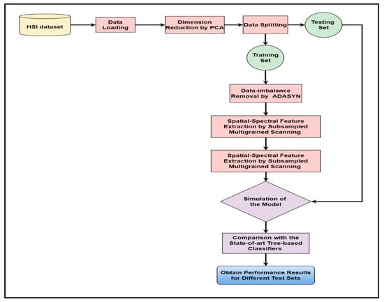Figure 1 displays the framework of our proposed approach for improving HSI categorization by coping with sample imbalance. Our research begins with collecting the HSI datasets available in the public domain. Then, the data were loaded into our programming environment using suitable code fragments. As a result, we obtained the false-color images of the datasets taken as inputs (Figure 2, Figure 3 and Figure 4). We used PCA to reduce the vast dimensions of the input images as preprocessing, then split the data into training and testing sets. The dataset for training was further used for training the model. The train set was first applied with ADASYN to overpopulate the minor class samples to match with the major class samples. The balanced dataset was then subsampled using multiple fixed-sized sliding masks (grains) to extract the spatial–spectral features embedded in each window. Then the collected features constructed the input vector to feed the classifier, i.e., enhanced deep CF. The whole process trained the model with deterministic components to simulate and evaluate the test datasets. The test results of our model were compared with other tree-based classifiers in similar conditions, and the performance analysis was recorded.