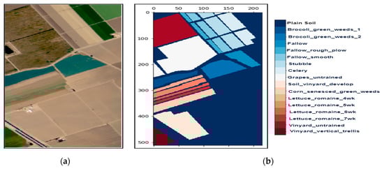 We collected three mostly explored HS datasets available in the public domain [] with significant applicability. The datasets were: (a) the AVIRIS Indian Pines (IP) site in Northwestern Indiana with 145 × 145 pixels with 200 working spectral reflectance bands and a class imbalance ratio of 73.6. The scene has 16 different landcover classes, as shown in Figure 2. The second dataset was: (b) the AVIRIS Salinas Valley (SV) site in California, USA, with 512 × 217 pixels with 204 working spectral reflectance bands and a class imbalance ratio of 12.51. The scene has 16 different landcover classes, as shown in Figure 3. The third dataset was: (c) the ROSIS-03 Pavia University (PU) site in Italy, with 610 × 340 pixels with 103 working spectral reflectance bands and a class imbalance ratio of 19.83. The scene has 9 different landcover classes, as shown in Figure 4. The ground data description of all the datasets is provided in Table 1.
